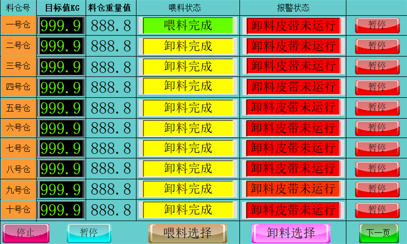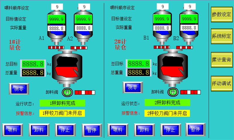 設置多個獨立儲料倉和多個獨立計量倉,對每種需要計量的物料預先按照各自配方進行喂料控制(分為高速喂料和低速喂料、提前量控制)進入計量倉內,等待生產需要時可以直接同步進行卸料。