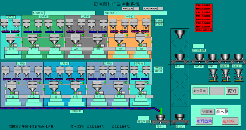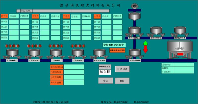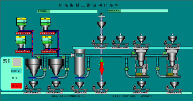 本公司擁有優良的生產設備和技術開發團隊,以良好的管理模式,豐富的生產和設計經驗為環保工作做出了的一定的貢獻。主要針對鋼鐵、耐材等行業無塵環保配料工藝的改進,設計和生產全自動化無塵配料設備。除塵部分分為:集中式收塵和分散式收塵。計量部分分為:增量計量和減量計量控制模式。控制部分分為:純單片機控制、單片機加PLC控制、純PLC控制。